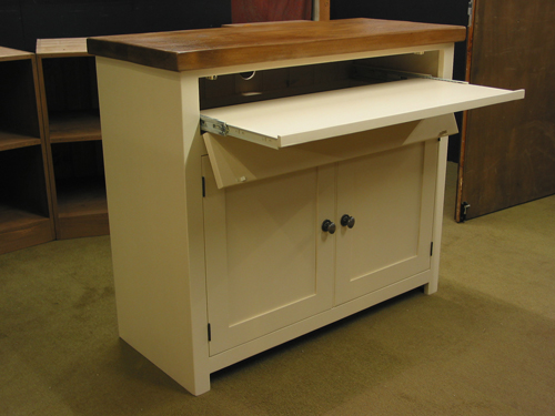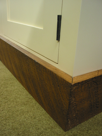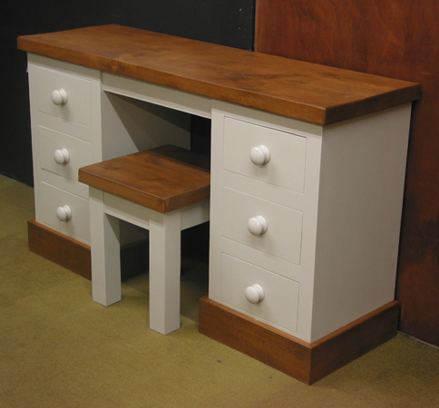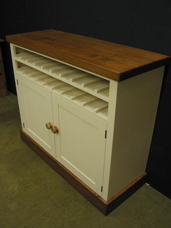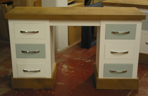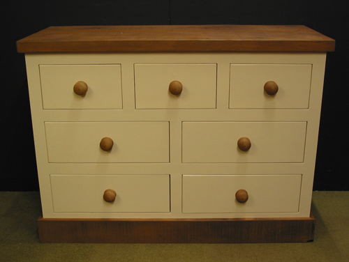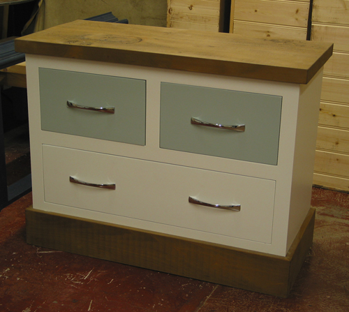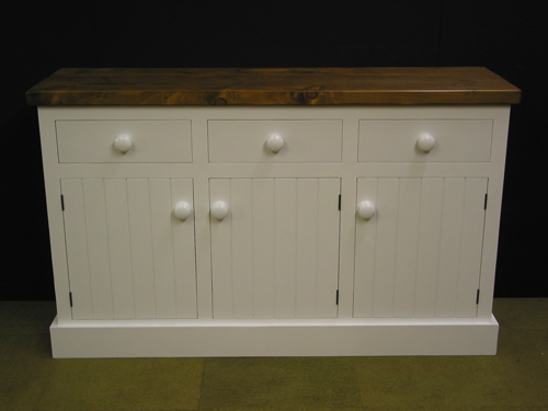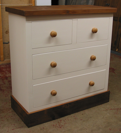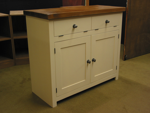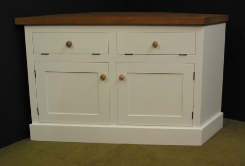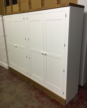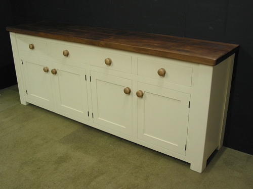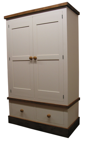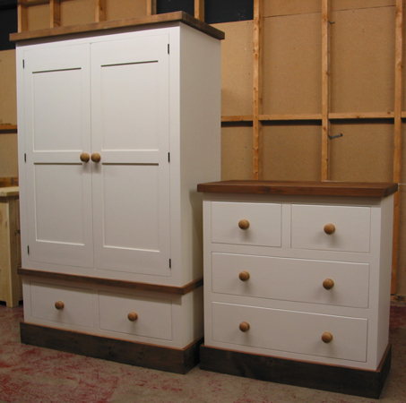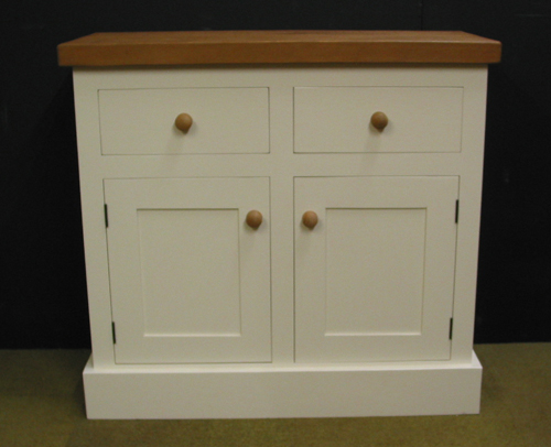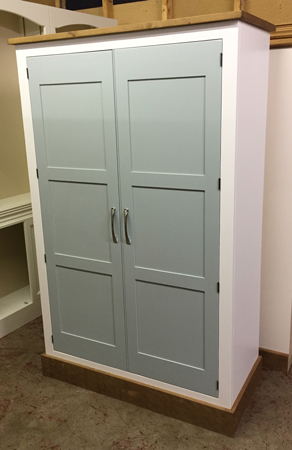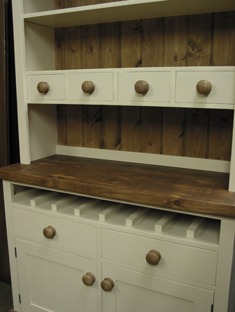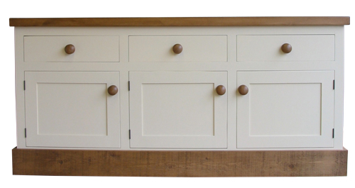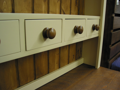 Shaker Framed Flat Door Panels, Flat Drawer Faces, Dovetail Drawers, Wooden Knobs (waxed or painted), Discreet Butt-Hinges.