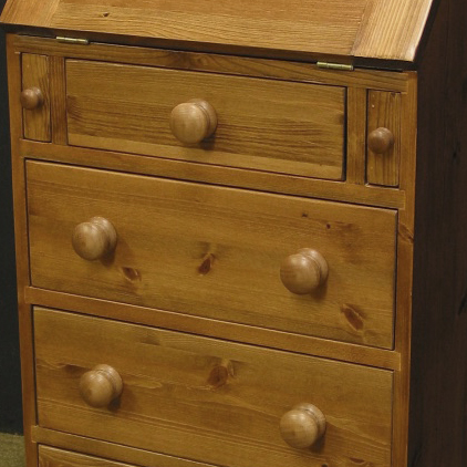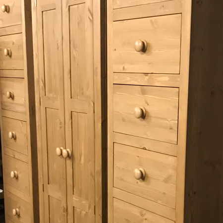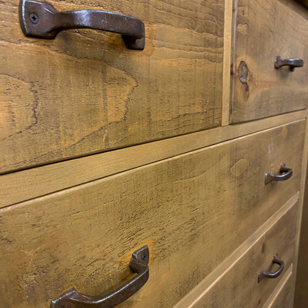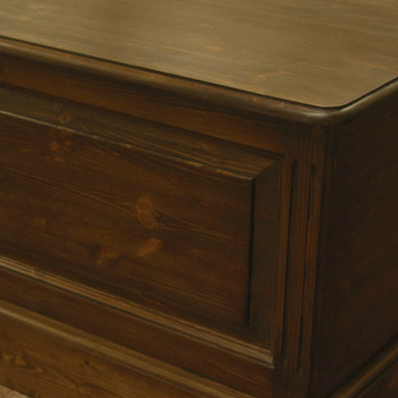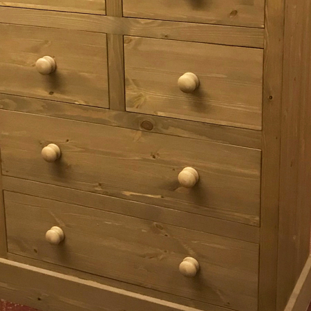 A golden antique stain is applied prior to finishing with a sprayed clear lacquer. Resulting in a sealed satin sheen finish, that needs minimal maintenance. This finish is often applied to tie-in with older pine furniture with a mellowed varnish finish.