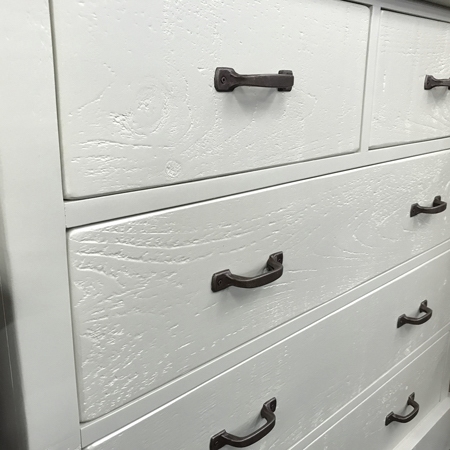 Light sanding retains much of the unique character of the reclaimed timber. The waxed finish darkens textured areas and deeper features, which naturally vary. Cut and machined faces remain smooth and appear paler, creating our most characterful finish for truly unique items of furniture.