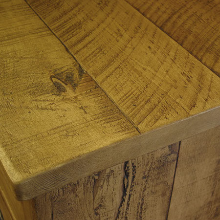 Textured rough sawn Quebec Yellow timber is carefully hand sanded to maintain natural features & imperfections, with saw & gripper marks an intended characteristic of this finish. As these characteristics vary from piece to piece, each item of furniture will present it's own unique features. Considered a more care free 'living finish', the wax finish highlights the unique characteristics of each piece of timber. Wax finishes can be left to develop & age with time & use, in the knowledge that, for high wear areas, an occasional fresh coat of wax will replenish colour to worn and marked areas.