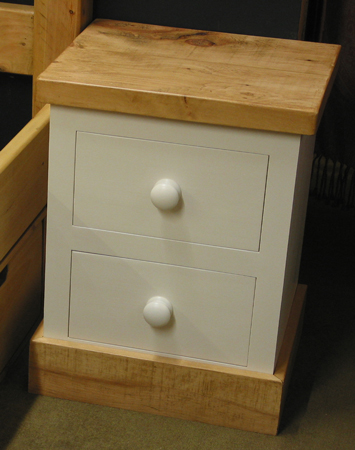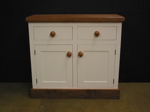 Shaker Framed Flat Door Panels, Flat Drawer Faces, Dovetail Drawers, Wooden Knobs (waxed or painted), Discreet Butt-Hinges.