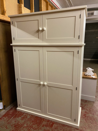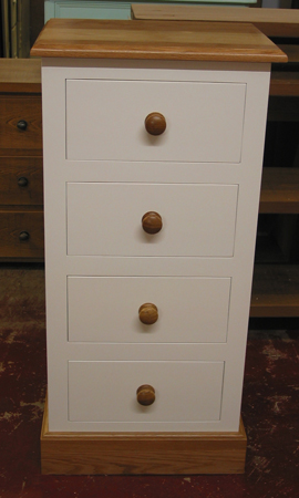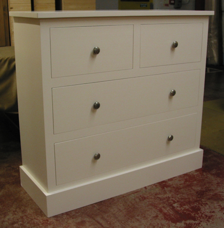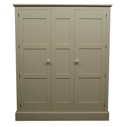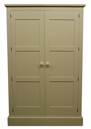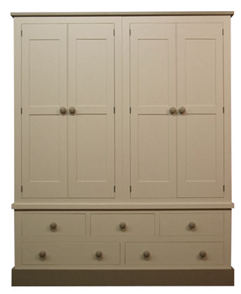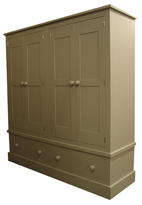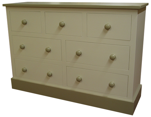 Shaker Framed Flat Door Panels, Flat Drawer Faces, Flat 28mm Thick Tops, Large Dovetail Drawers, Wooden Knobs, Discreet Butt-Hinges, Plinth Base.